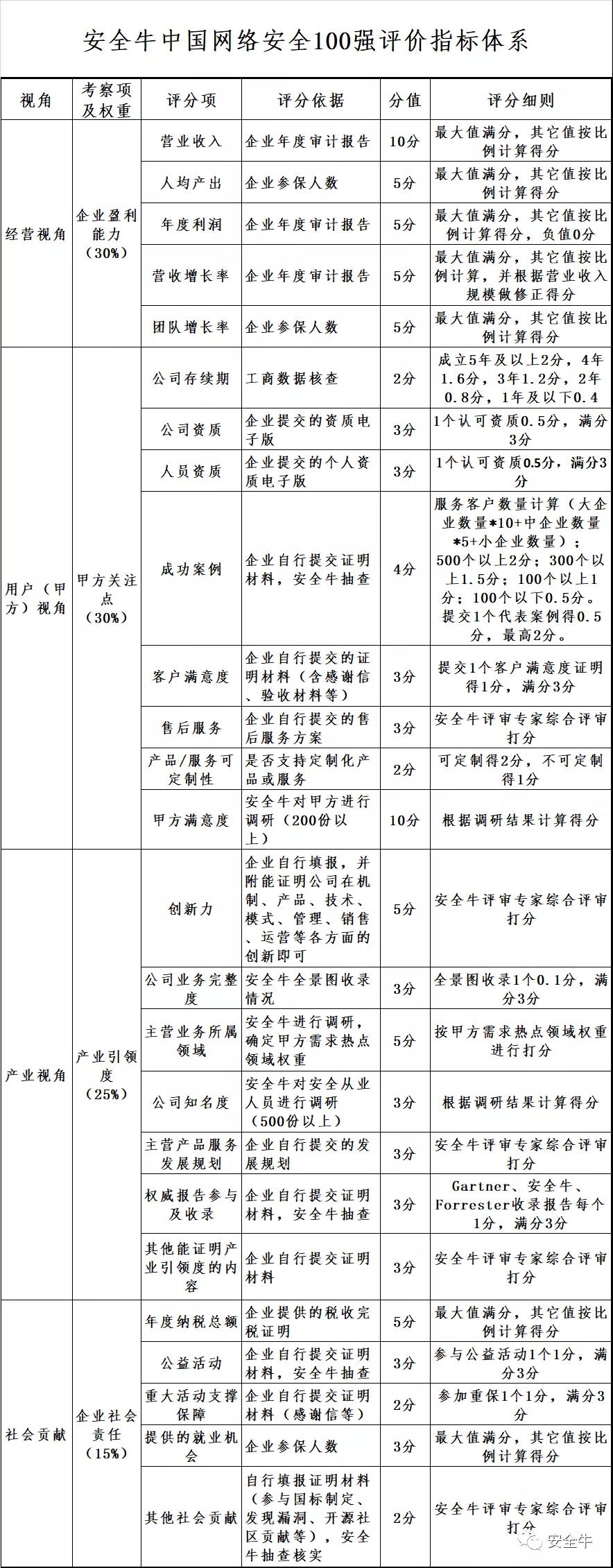 2020年度安全牛中國網(wǎng)絡(luò)安全百強評委會咨詢了大量投資機構(gòu)專家、企業(yè)技術(shù)決策者和安全企業(yè)領(lǐng)導(dǎo)者,設(shè)計并啟用了基于全新價值原則的多維度評價指標(biāo)體系。