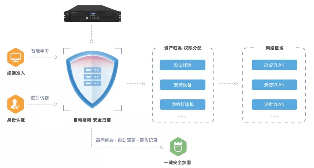 不同于傳統(tǒng)準(zhǔn)入復(fù)雜配置的802.1x技術(shù),世安網(wǎng)絡(luò)準(zhǔn)入控制系統(tǒng)采用秒級(jí)旁路部署結(jié)合自動(dòng)化運(yùn)維技術(shù),在部署過程中無(wú)需安裝客戶端無(wú)需復(fù)雜命令,在不改造用戶網(wǎng)絡(luò)的情況下,即可一鍵安裝到位,實(shí)現(xiàn)終端認(rèn)證、訪問控制和物理定位的一體化管理。