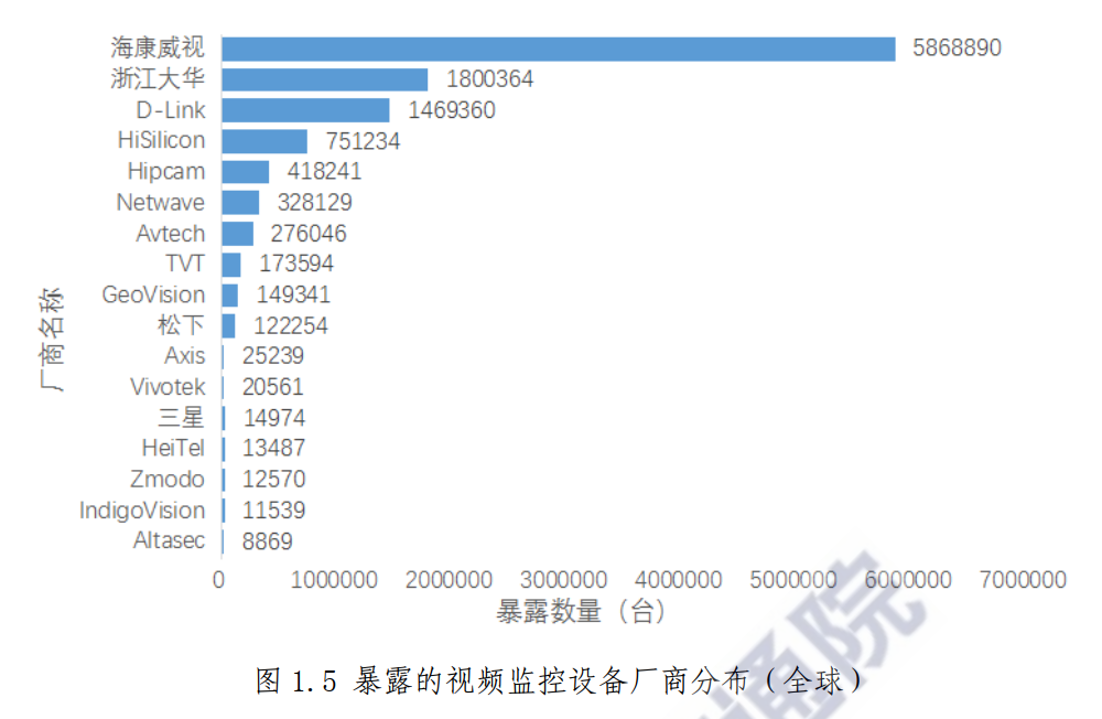 2018年9月,根據(jù)中國信息通信研究院發(fā)布的《物聯(lián)網(wǎng)安全白皮書(2018)》顯示:在視頻監(jiān)控設備方面,我國國產設備的視頻監(jiān)控設備暴露嚴重, ??低暫驼憬笕A的視頻監(jiān)控設備暴露嚴重,其中,??低暠┞对O備總量超過了 580 萬臺,浙江大華、 D-Link等廠商的視頻監(jiān)控設備暴露數(shù)量也都達到了百萬量級。