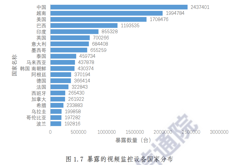 同時,我國暴露于互聯(lián)網(wǎng)的視頻監(jiān)控設備數(shù)量已屬于全球前列,暴露的視頻監(jiān)控設備總數(shù)超過 240 萬臺,安全問題存在較大隱患,亟需重視!