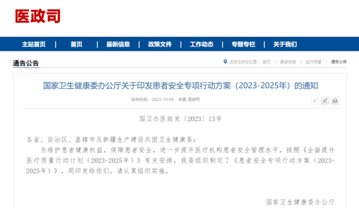 為維護(hù)患者健康權(quán)益,保障患者安全,進(jìn)一步提升醫(yī)療機(jī)構(gòu)患者安全管理水平,國家衛(wèi)生健康委制定并發(fā)布了《患者安全專項行動方案(2023-2025年)》(以下簡稱《行動方案》)。
