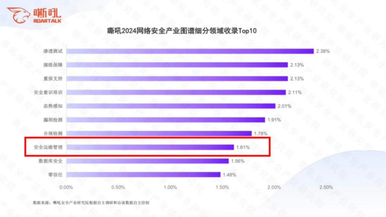 而在細(xì)分賽道方面,“安全運(yùn)維管理”居于本次圖譜細(xì)分領(lǐng)域收錄占比前10名之中,反映了企業(yè)對(duì)于持續(xù)監(jiān)控和保護(hù)關(guān)鍵業(yè)務(wù)運(yùn)營和敏感數(shù)據(jù)的重視。